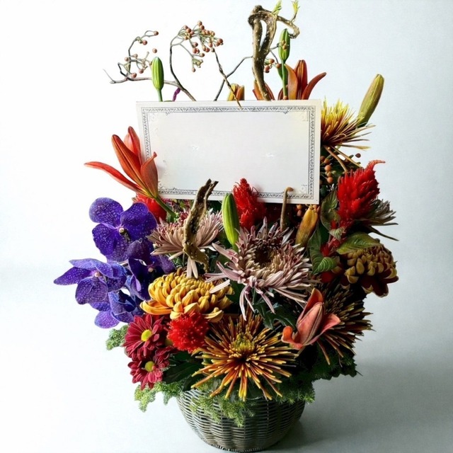 開店祝いや周年祝い、移転・昇進など、 「ちゃんと気持ちが伝わる」シーンにおすすめの祝い花アレンジメントです。 百合、菊、蘭など存在感のある花材を中心に、 動きのある枝ものと色のコントラストを効かせた、華やかさと力強さをあわせ持つデザインに仕上げました。 遠くから見ても目を引き、近くで見るほど表情のあるアレンジメントは、お店やオフィスの空間を一気に引き締めてくれます。 立札は用途に合わせてお付けいたします (※内容はご注文時にご記入ください) サイズ目安:高さ 約80cm前後/幅 約50cm前後 ※箱代・送料込みのお値段です。 ※使用花材は季節・入荷状況により多少変わりますが、全体の雰囲気・ボリューム感は写真同等でお作りします。