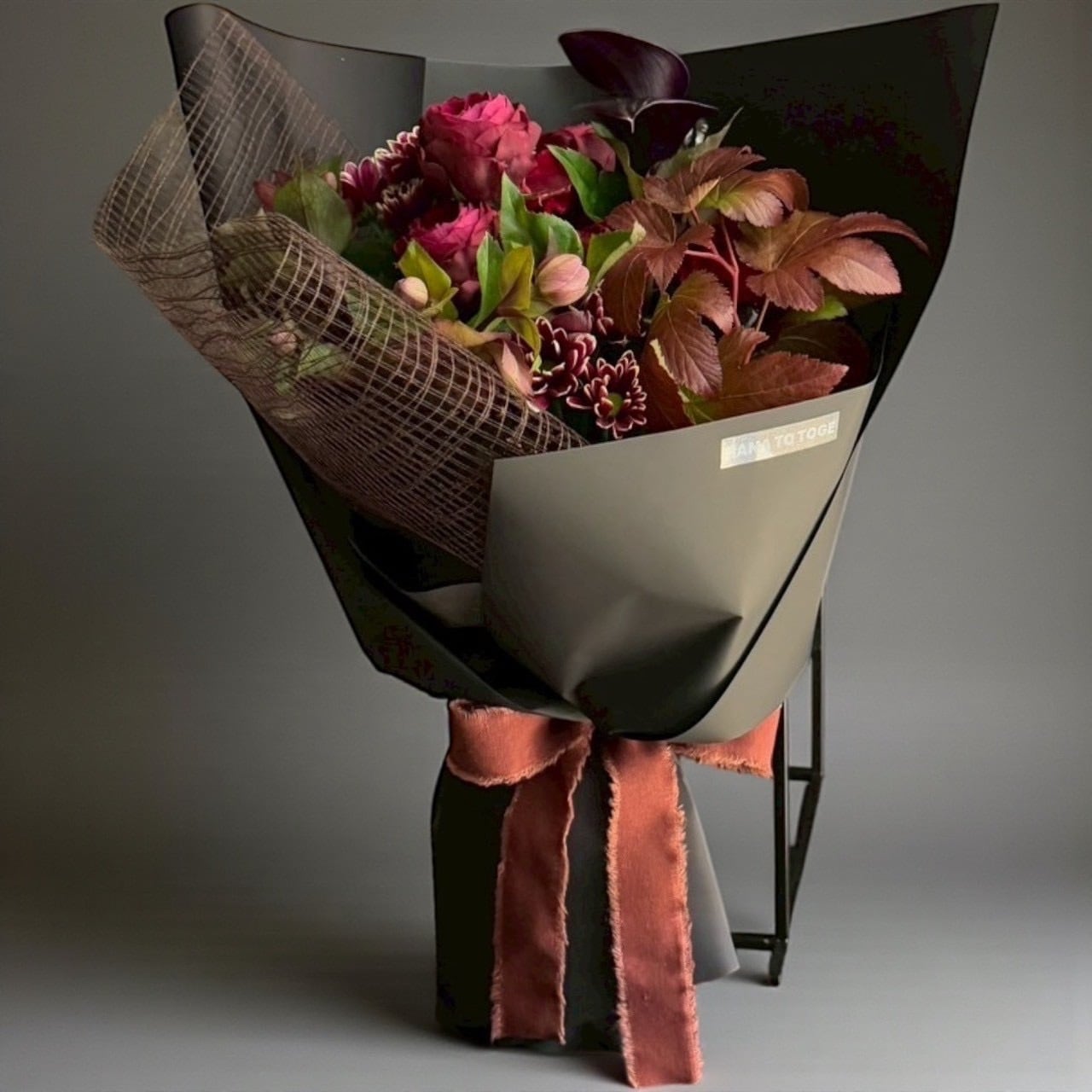 落ち着いた色合いの中に、静かな華やかさを忍ばせたハナとトゲらしい季節のブーケです。